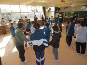 「みんなで運ぼう!フラフープ」というゲームを行い、たくさん言葉かけを行いました。