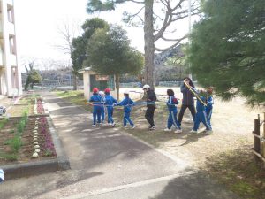 休み時間は、フラフープ列車で遊ぶ姿が見られました。