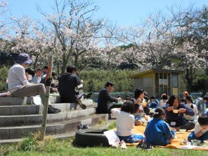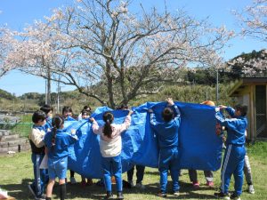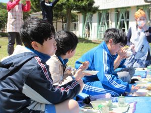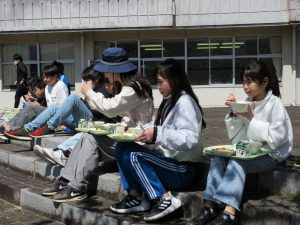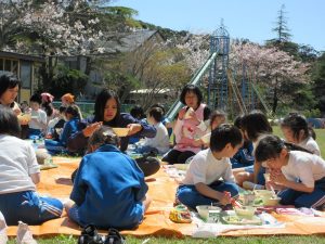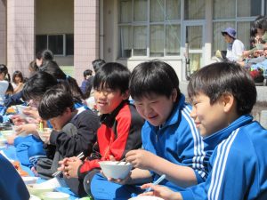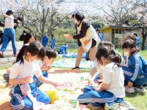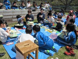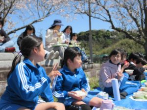 中西最後のさくらを見ながら、自然の中で食べる給食は、おいしく、楽しい時間となりました。