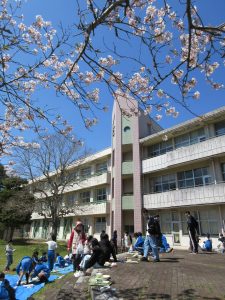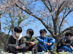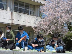 天気がよかったので、今日は全校でお花見給食をしました。きれいな桜の花を見ながら、楽しいひとときを過ごせました。