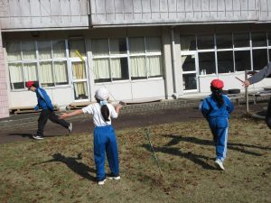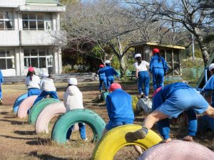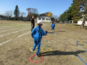 2時間目のあとの休み時間に全校児童で「けんけんぱ/ラダー」「ななめけんすい/ぶらさがり」「うんてい」「玉入れ」「タイヤ」「バトン投げ」に取り組んでいます。環境委員会の企画です。さわやかな気候は、運動にもってこい。みんな一生懸命走っています。終わった後は、手洗い、うがいも忘れずにします。