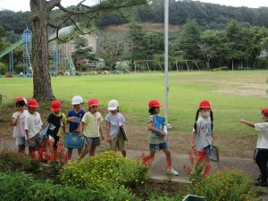 「え~、茶わん蒸しに入ってるおいしいやつ?」「1個しか入ってないやつだよね。」驚いた様子で、ぎんなんの実に興味津々。1年生がイチョウの木の下で、秋を探しています。