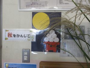 今週の月曜日はお月見でした。学校の「秋をかんじて」コーナーに、満月やおだんごのイラストにススキがかざられました。奈良毛にはえている本物のススキです。
