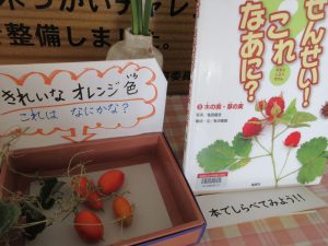 となりには、本物のカラスウリと『せんせい!これなあに?』の本。カラスウリが置いてあるのを見て、司書の先生がさっとそえてくれました。素敵な秋です。
