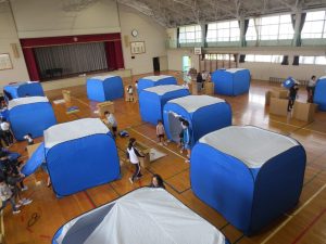 避難所として、段ボールベット、簡易テントの組み立てを行いました。