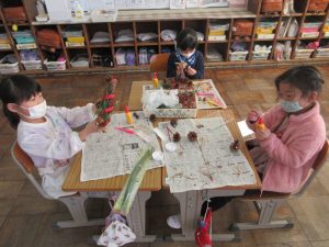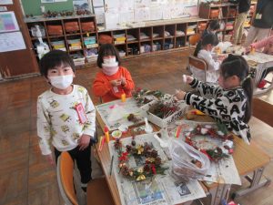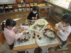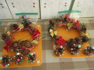 芋づるの他にも、松ぼっくりや松、リボンなどで装飾を施し、接着して仕上げていきました。