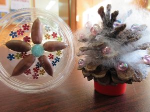 また別の日に、別のサンタさんがやってきました。どんぐりで使った飾りと松ぼっくりのクリスマスツリーをプレゼントしてくれました。何て素敵な贈り物なんでしょう。幸せが皆さんにも届きますように。