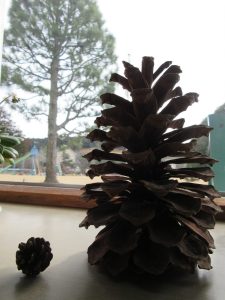 写真の大きなまつぼっくりは、後ろに見える背の高い大王松(だいおうしょう)の木からとれたものです。左の小さな小さなまつぼっくりは、多行松(たぎょうしょう)の木の周りに落ちているものです。同じまつぼっくりでも、大小さまざま。それぞれに味があって素敵です。人とおんなじ。