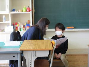 修了式の日は、6年生の教室はがらんとしていました。他の学年では、通知表を受け取る様子が見られました。
